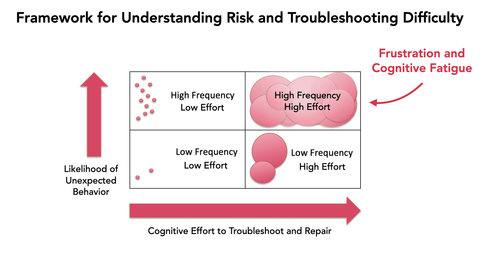 Our theory summarizes this idea with a simple 2x2 framework illustrating the relationship between the likelihood of unexpected behavior (puzzling events) and the cognitive effort required to troubleshoot, highlighting how compounding difficulties can lead to cognitive fatigue: