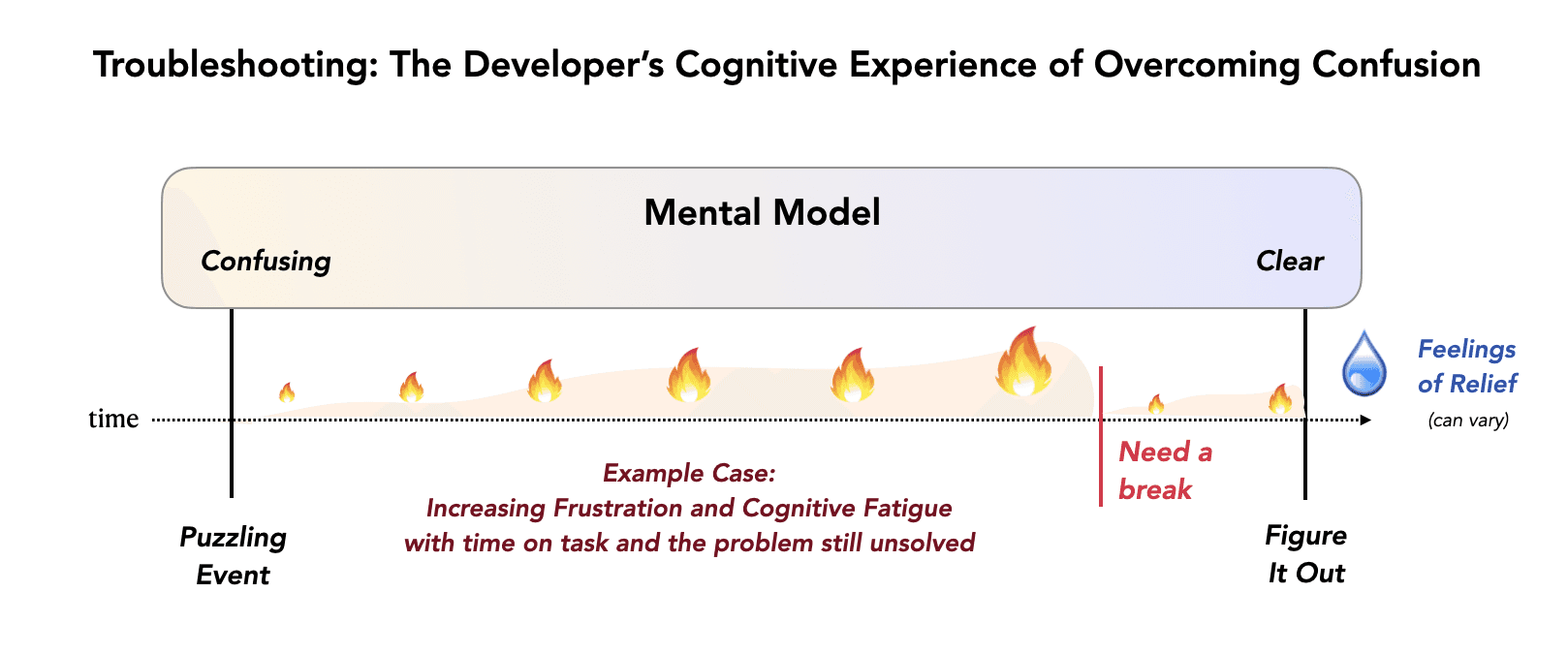 This seed of an idea directly shaped the direction of our recent grounded theory study at University of Victoria, where we set out to better understand the developer’s cognitive experience of troubleshooting and to develop a theory rooted in cognitive science that could give developers the words to explain what’s happening. Troubleshooting is a particularly intense and draining aspect of software work, placing sustained demands on attention, working memory, and mental modeling. By surfacing and naming the confusion experience inherent in troubleshooting in terms of neurological and attentional dynamics, our theory explains how prolonged troubleshooting can deplete cognitive resources and lead to cognitive fatigue. This reframes the mental strain developers are experiencing as a capacity constraint, rather than simply an emotion.